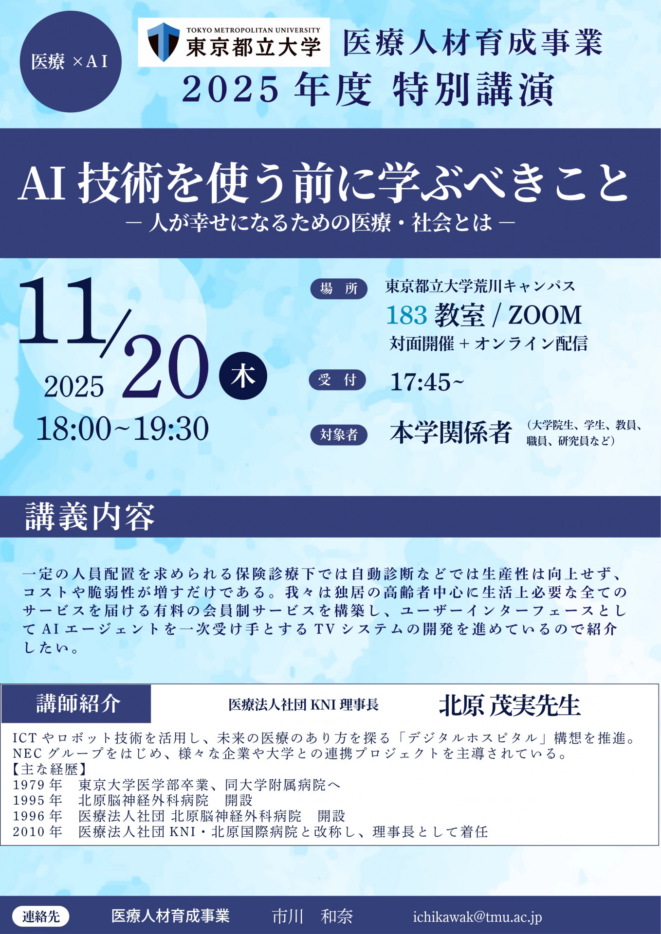 医療法人社団KNI理事長 北原茂実先生をお招きし、AIを活用した医療福祉サービスの開発についてご講演いただき、未来の医療・社会の在り方を考えていきます。
