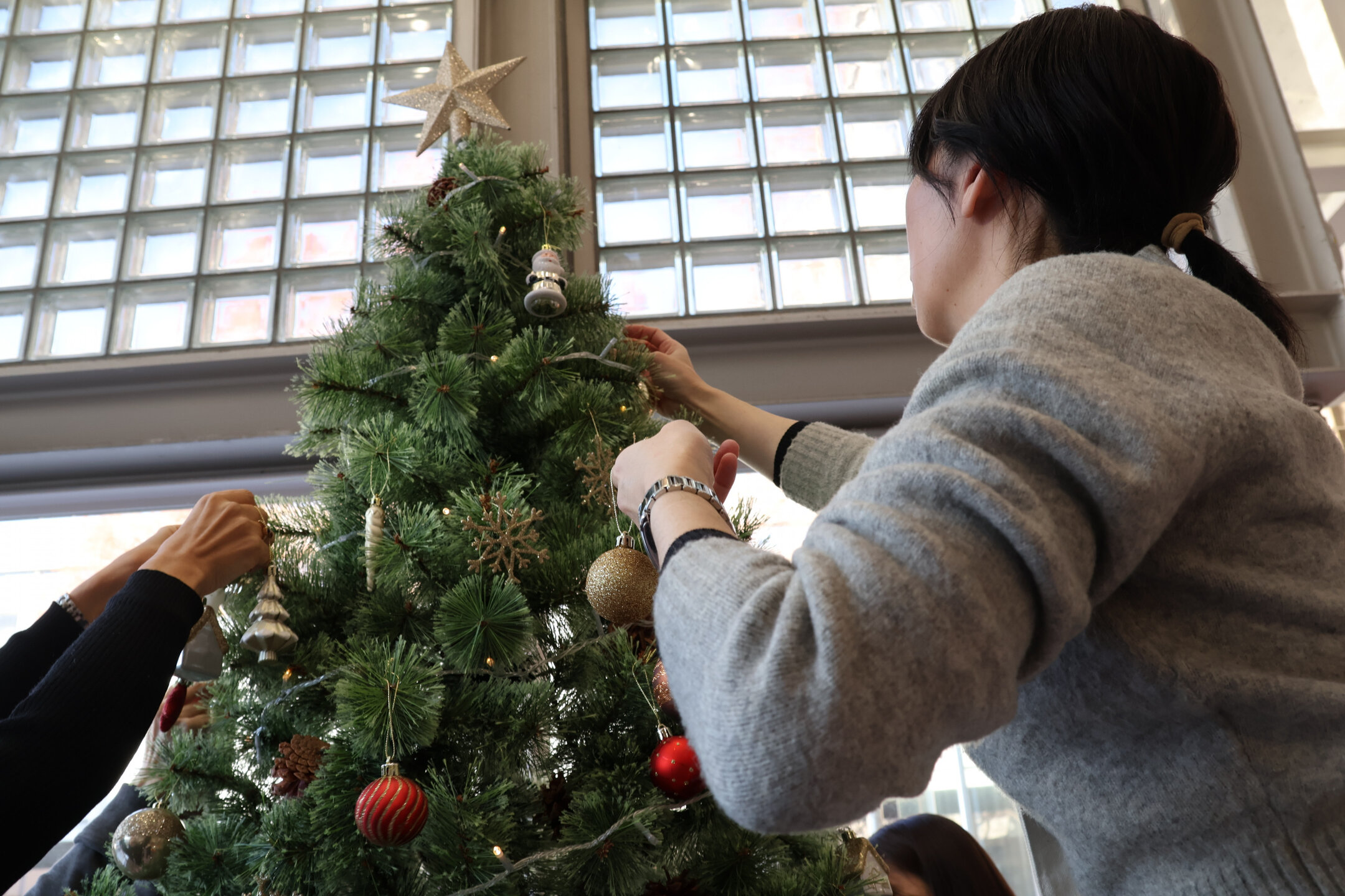 荒川キャンパスの冬に彩りを加えるため、渡り廊下に1本、食堂に1本、ツリーを立てております。